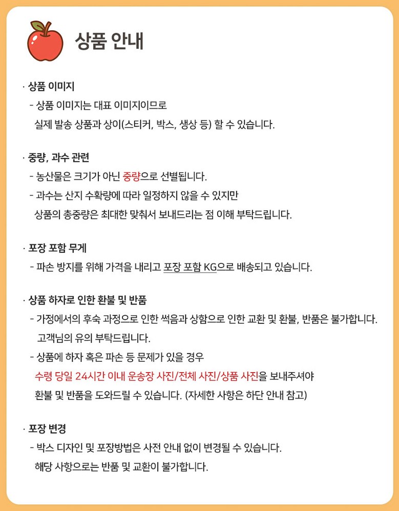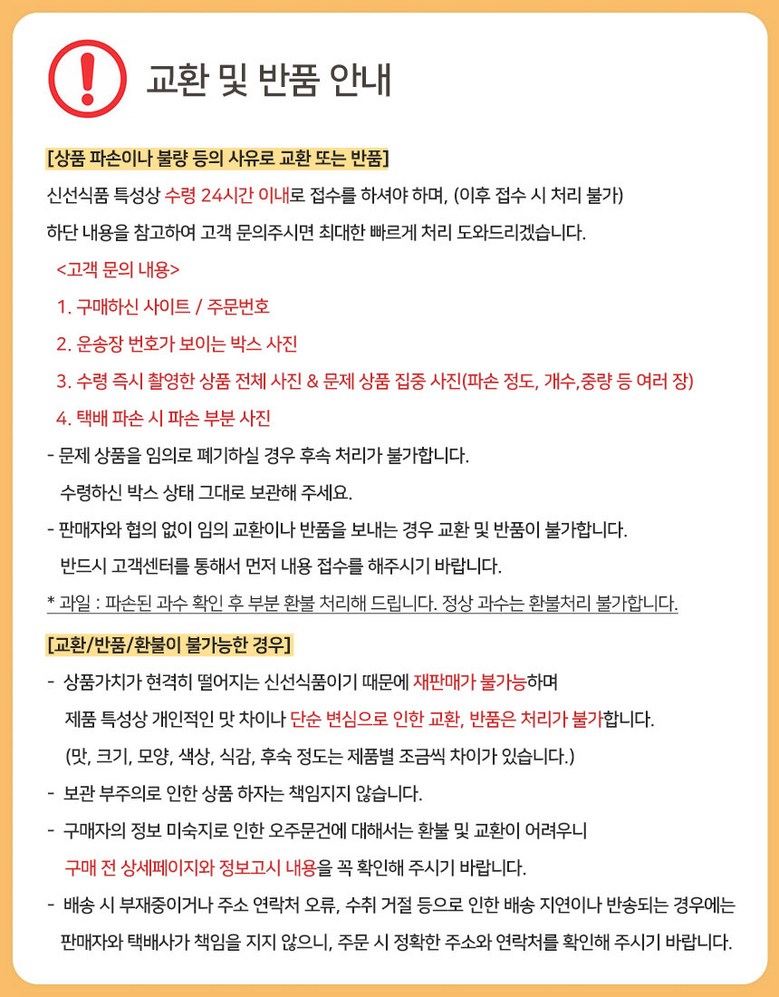 - ㆍ교환/반품에 관한 일반적인 사항은 판매자가 제시사항보다 관계법령이 우선합니다.
