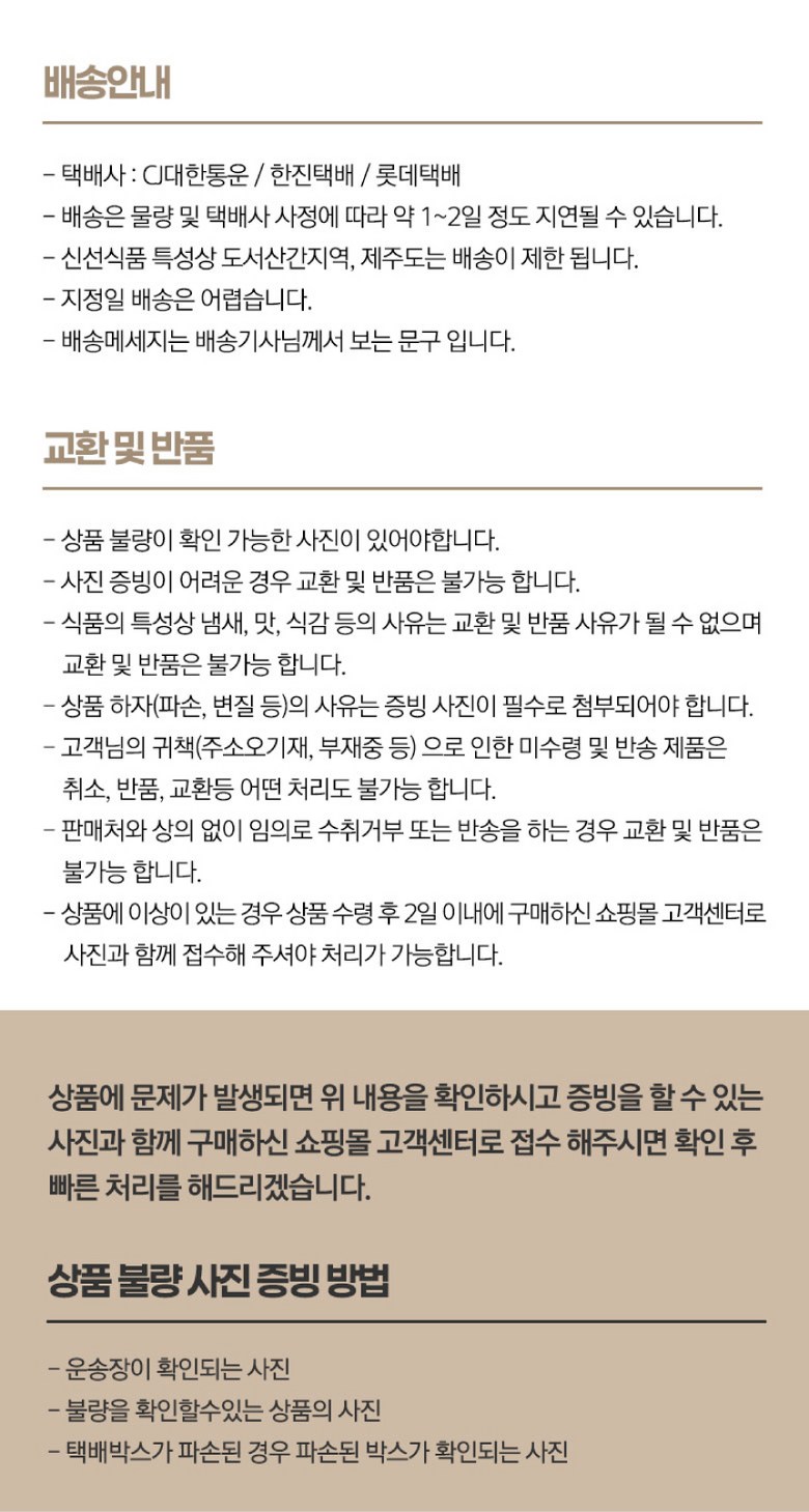 - ㆍ모니터 해상도의 차이로 인해 색상이나 이미지가 실제와 달라, 고객이 단순 변심으로 교환/반품을 무료로 요청하는 경우