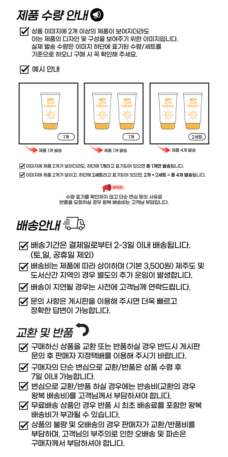 - ㆍ모니터 해상도의 차이로 인해 색상이나 이미지가 실제와 달라, 고객이 단순 변심으로 교환/반품을 무료로 요청하는 경우
