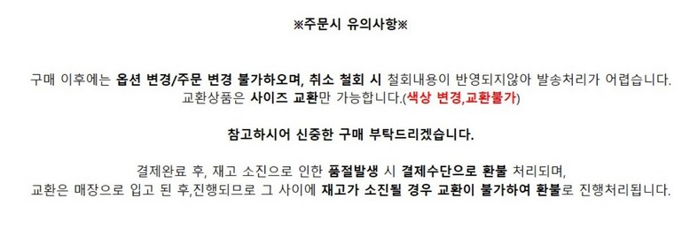 - ㆍ교환/반품에 관한 일반적인 사항은 판매자가 제시사항보다 관계법령이 우선합니다.
