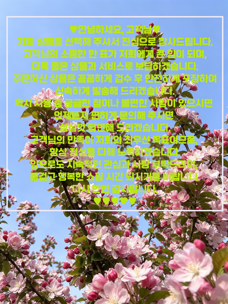 | 배송방법 | 순차배송 | 배송비 | 무료배송 - 도서산간 지역 배송불가 |