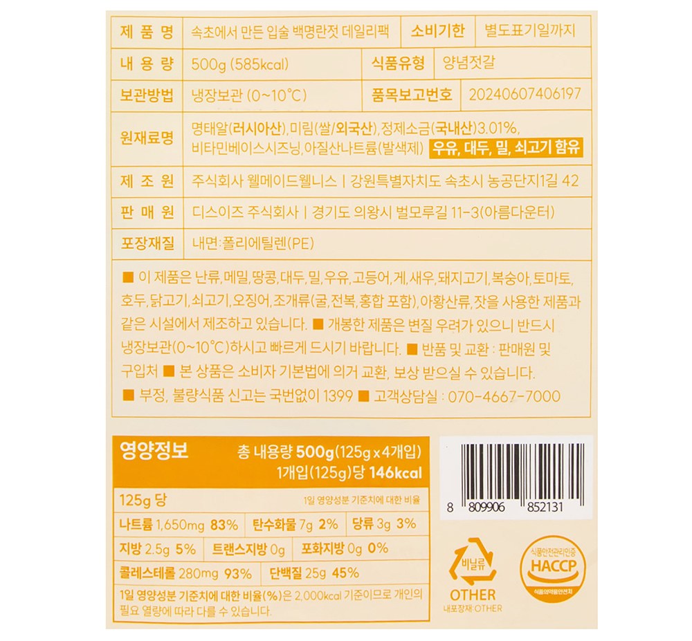 · 125g씩 소포장 된 명란 4팩으로 구성되어 있습니다.