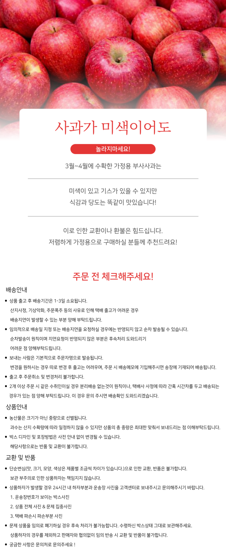 | 품목 또는 명칭 | 부사사과 | 포장단위별 내용물의 용량(중량),수량,크기 | 상품 상세페이지 참조 |