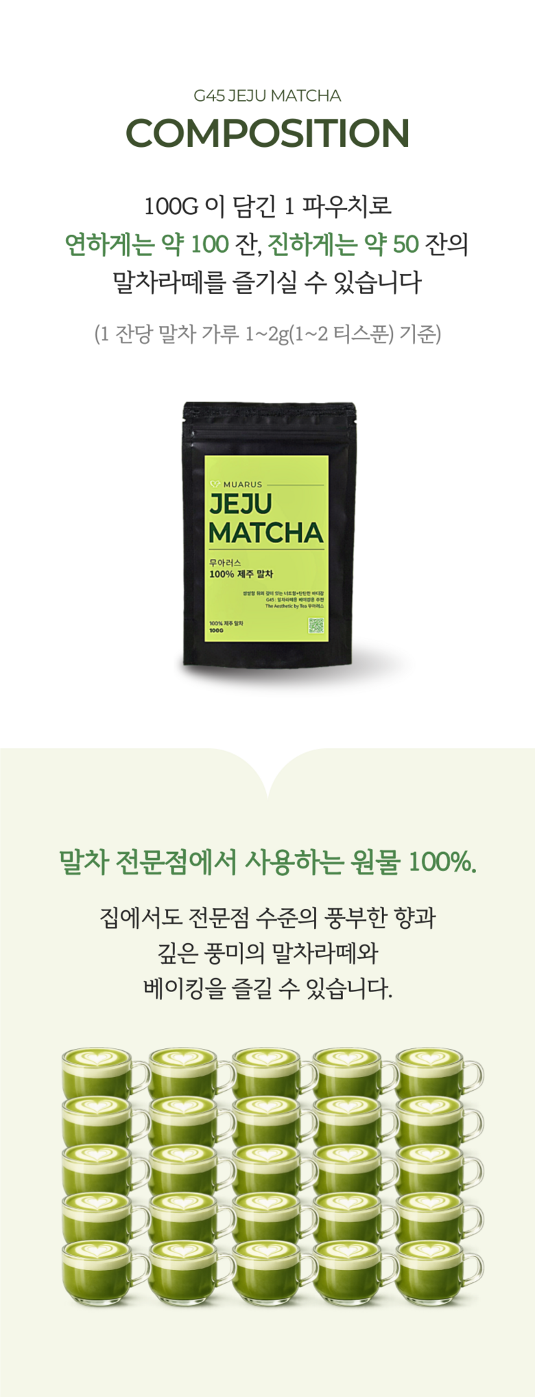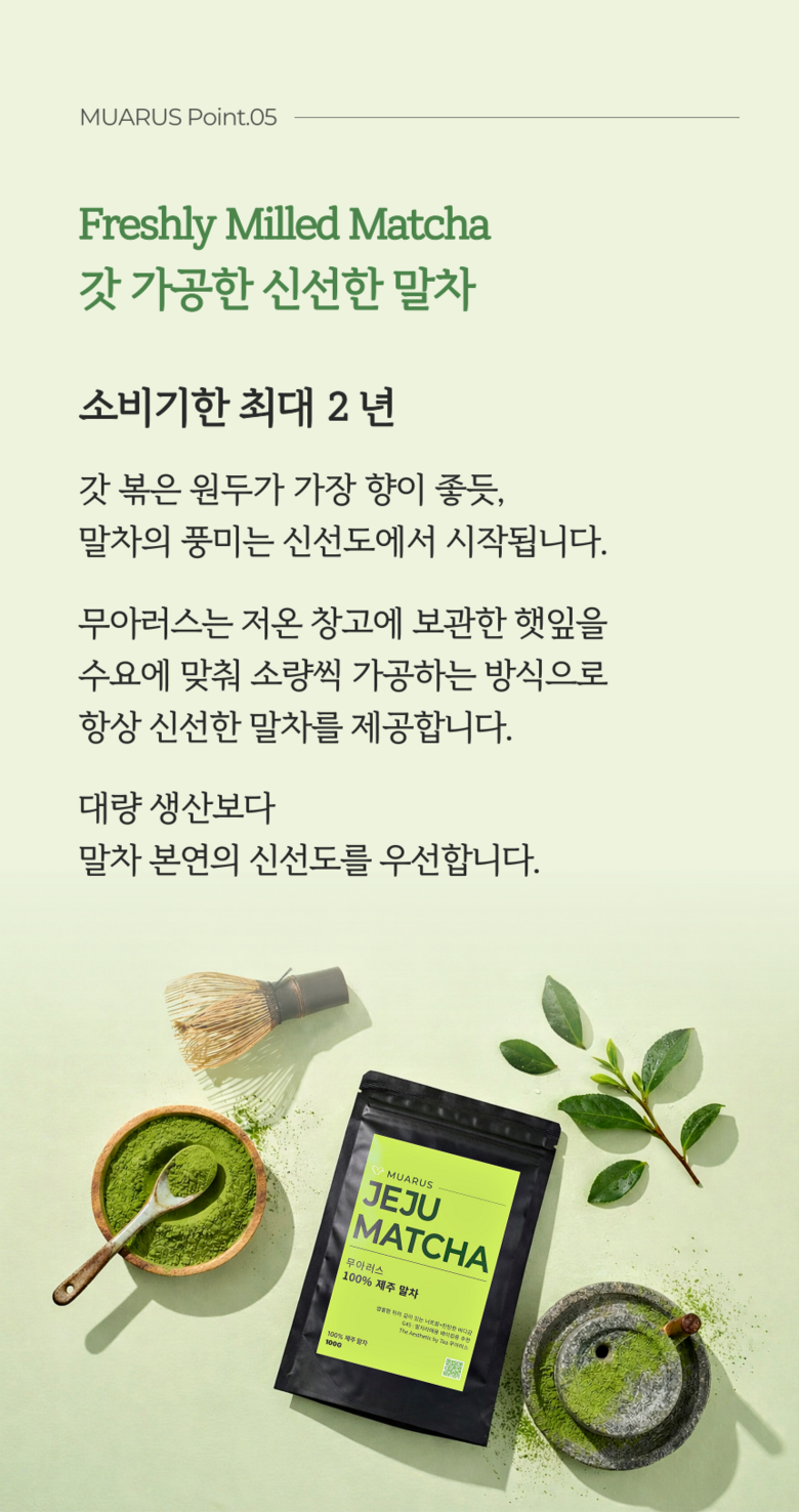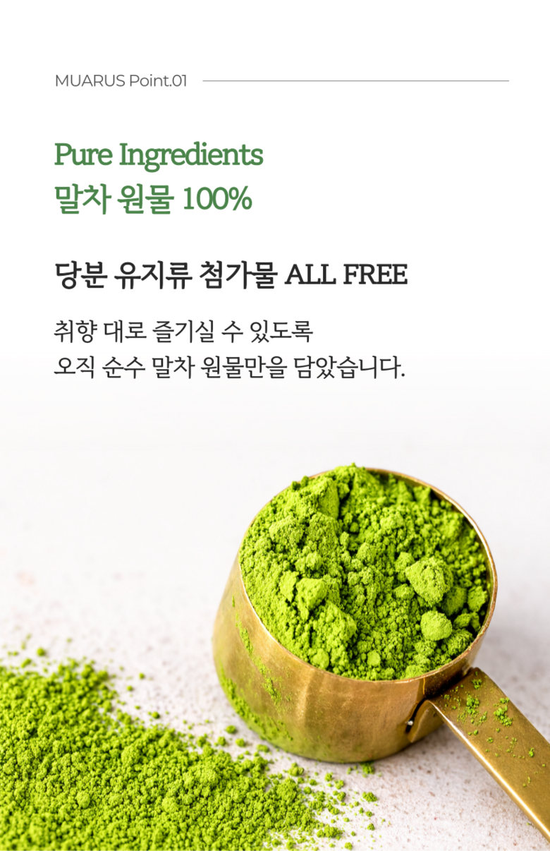 | 품목 또는 명칭 | 무아러스 100% 고급 제주말차 | 포장단위별 내용물의 용량(중량),수량,크기 | 100g |