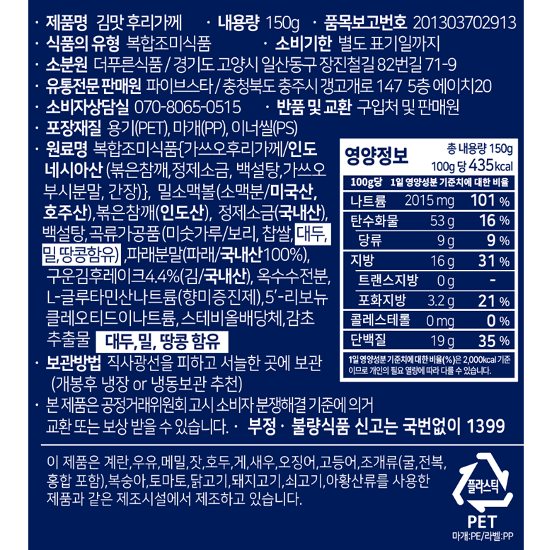 | 포장단위별 내용물의 용량(중량), 수량 | 150g | 원재료명 및 함량 | 상품 상세페이지 참조 |