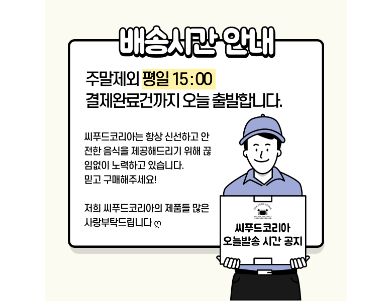 | 배송방법 | 신선/냉장/냉동 | 배송비 | 무료배송 - 도서산간 지역 배송불가 |
