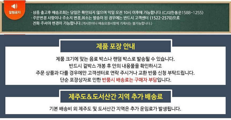 | 배송기간 | ㆍ도서산간 지역 등은 배송에 3-5일이 더 소요될 수 있습니다. - 천재지변, 물량 수급 변동 등 예외적인 사유 발생 시, 다소 지연될 수 있는 점 양해 부탁드립니다. | ||