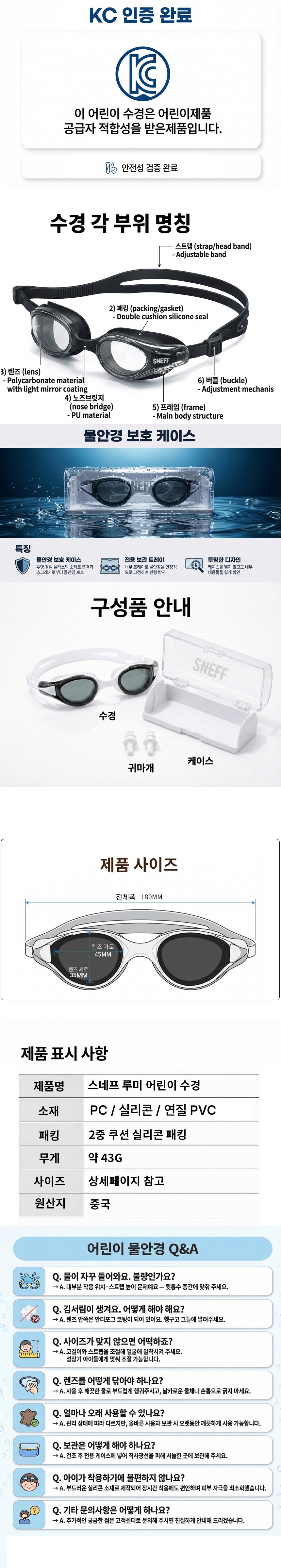 | 품명 및 모델명 | 스네프 루미 물안경 | KC 인증정보 | 물안경, 케이스, 귀마개: 유/KC마크 |
