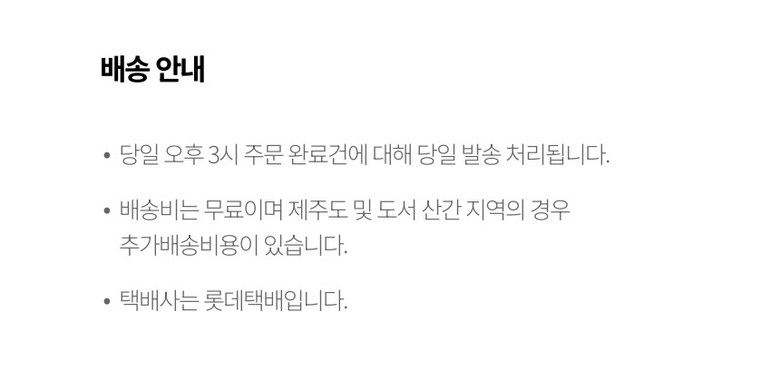 | 배송방법 | 순차배송 | 배송비 | 무료배송 - 도서산간 지역 배송불가 |