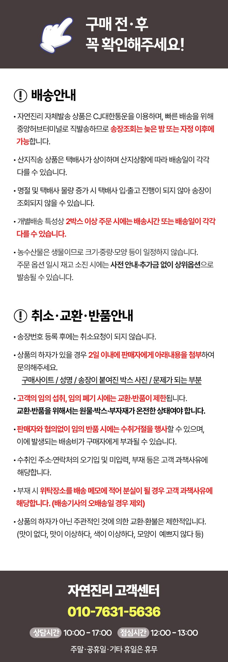 - ㆍ교환/반품에 관한 일반적인 사항은 판매자가 제시사항보다 관계법령이 우선합니다.