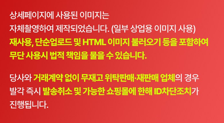 - ㆍ모니터 해상도의 차이로 인해 색상이나 이미지가 실제와 달라, 고객이 단순 변심으로 교환/반품을 무료로 요청하는 경우