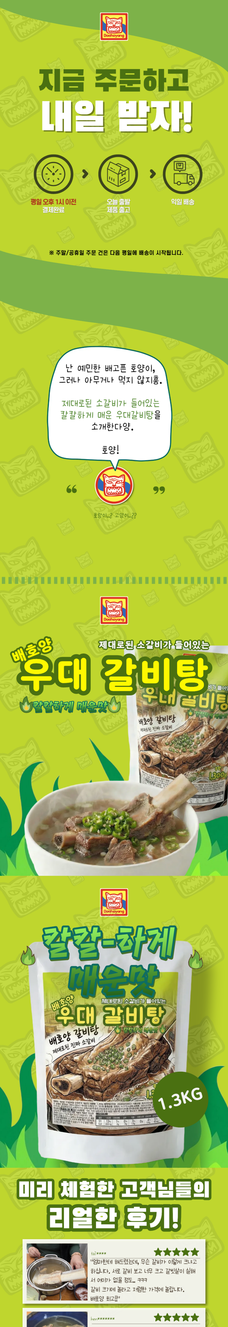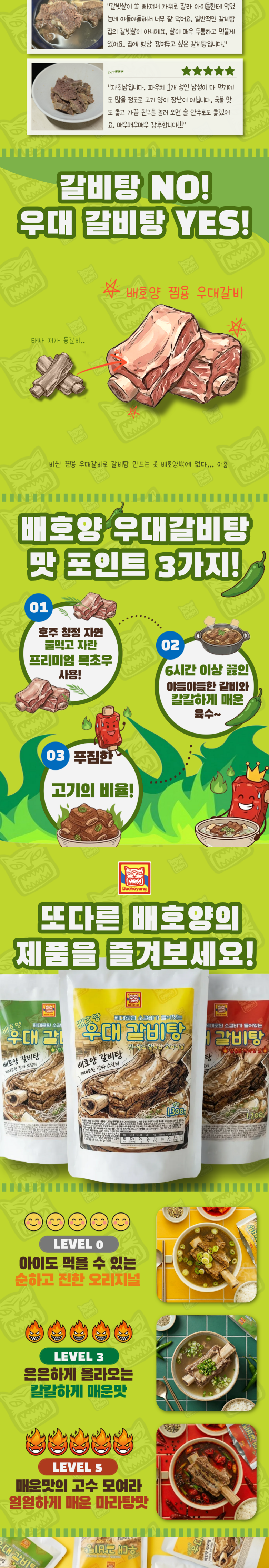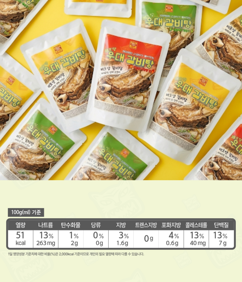 | 품목 또는 명칭 | 배호양 우대 갈비탕 칼칼하게 매운맛 | 포장단위별 내용물의 용량(중량),수량,크기 | 파우치 1개당 1.3kg |