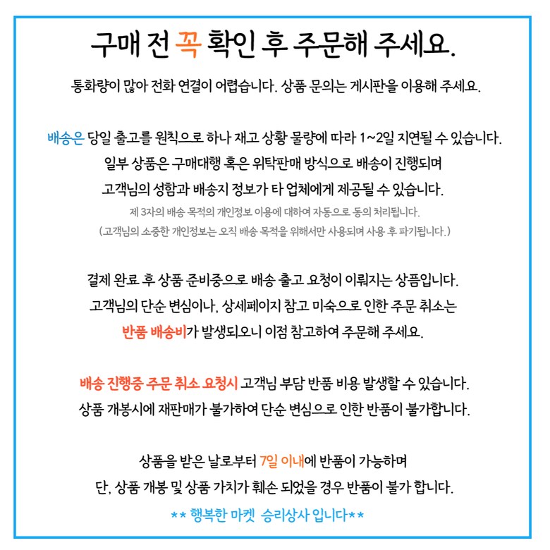 - 상품문의 및 후기게시판을 통해 취소나 환불, 반품 등은 처리되지 않습니다.