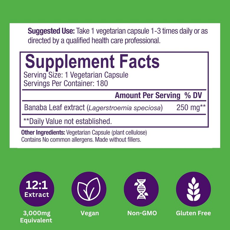 바나바 잎 추출물이 12:1 비율로 농축되어 있는 식이 보충제입니다. 균형 잡힌 비율로 만들었습니다. 1회 제공량 당 3000mg의 바나나 잎과 동등한 성분을 제공합니다.