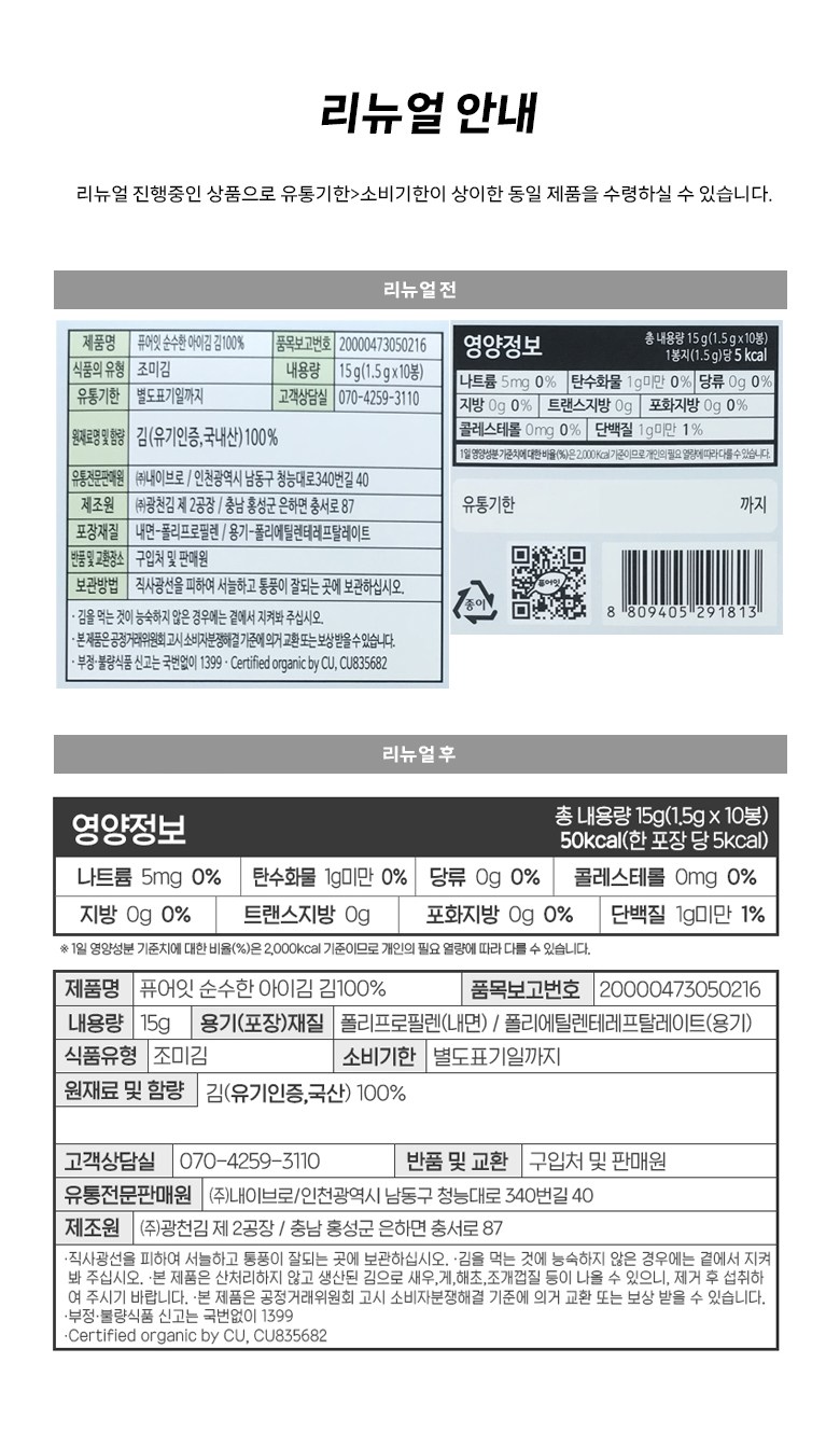 | 포장단위별 내용물의 용량(중량), 수량 | 컨텐츠 참조x 4개 | 원재료명 및 함량 | 컨텐츠 참조 |