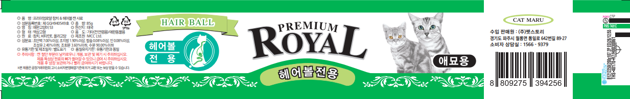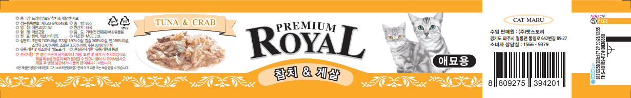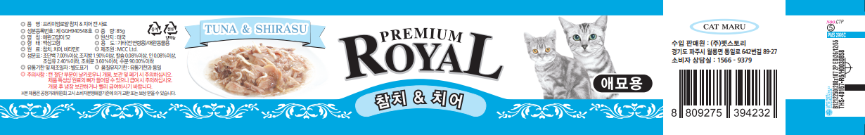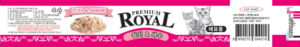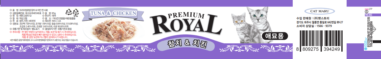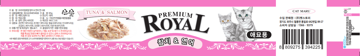 | 품명 및 모델명 | 프리미엄로얄 참치&게살 캔 사료 + 프리미엄로얄 참치&새우 캔 사료 + 프리미엄로얄 참치&연어 캔 사료 + 프리미엄로얄 참치&치어 캔 사료 + 프리미엄로얄 참치&치킨 캔 사료 + 프리미엄로얄 참치&헤어볼 캔 사료 | 인증사항 | 사료관리법에 따른 성분등록번호 : 컨텐츠 참조 |
