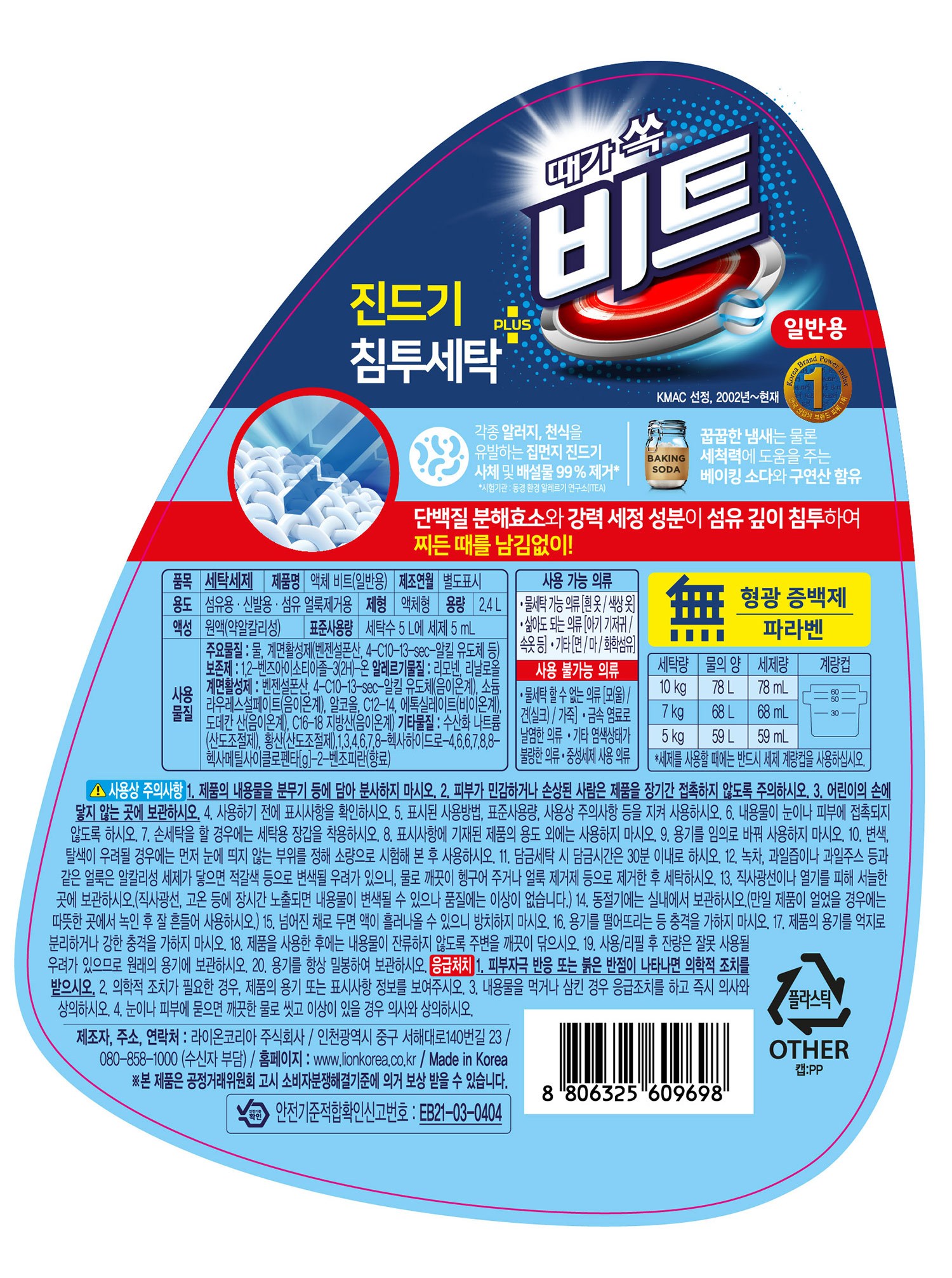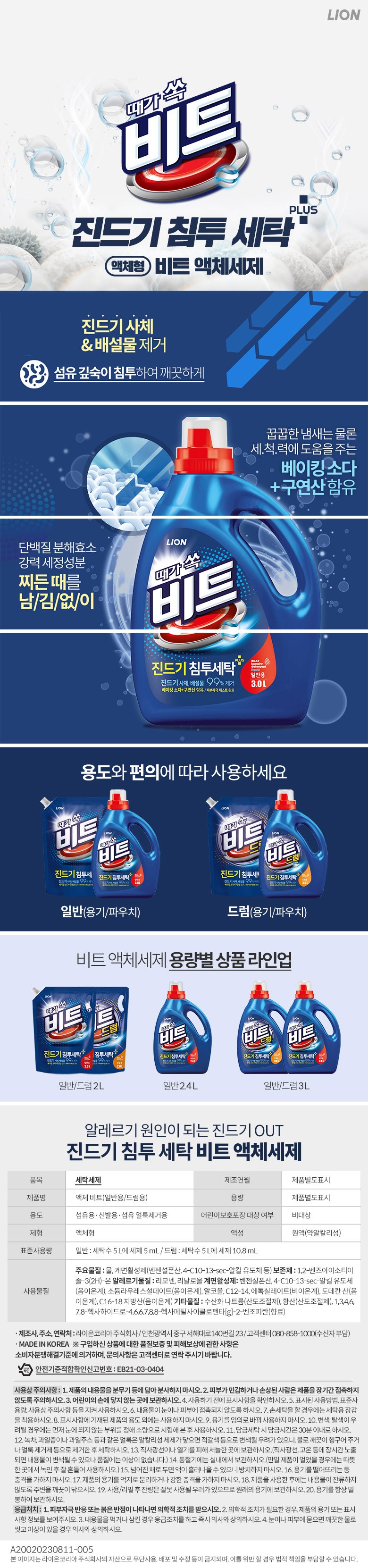 | 품목 및 제품명 | 세탁세제 / 액체 비트(일반용) | 용도(표백제의 경우 계열을 함께표시) 및 제형 | 섬유용,신발용,섬유 얼룩제거용 / 액체형 |